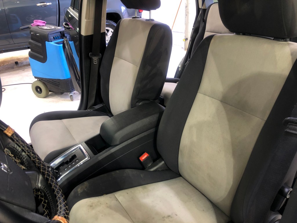 When you pick up the car, it will have a paper mat to protect the carpet from your dirty shoes, and a plastic covering over the driver’s seat. Please keep your windows cracked until all the moisture has dried, then feel free to put in the other mats that you may have.